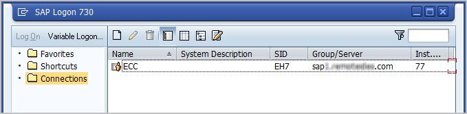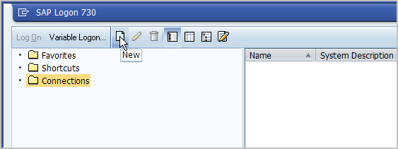 - In SAP Logon, click to select the Connections folder, then in the toolbar, click New to create a new system entry.