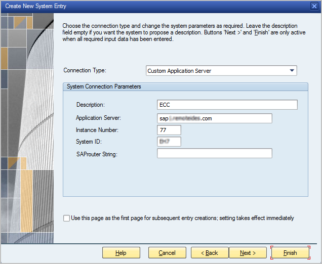 - In the Create New System Entry wizard that appears, on the first page, click Next, then fill in the System Connection Parameters with values like the following on the second page.
