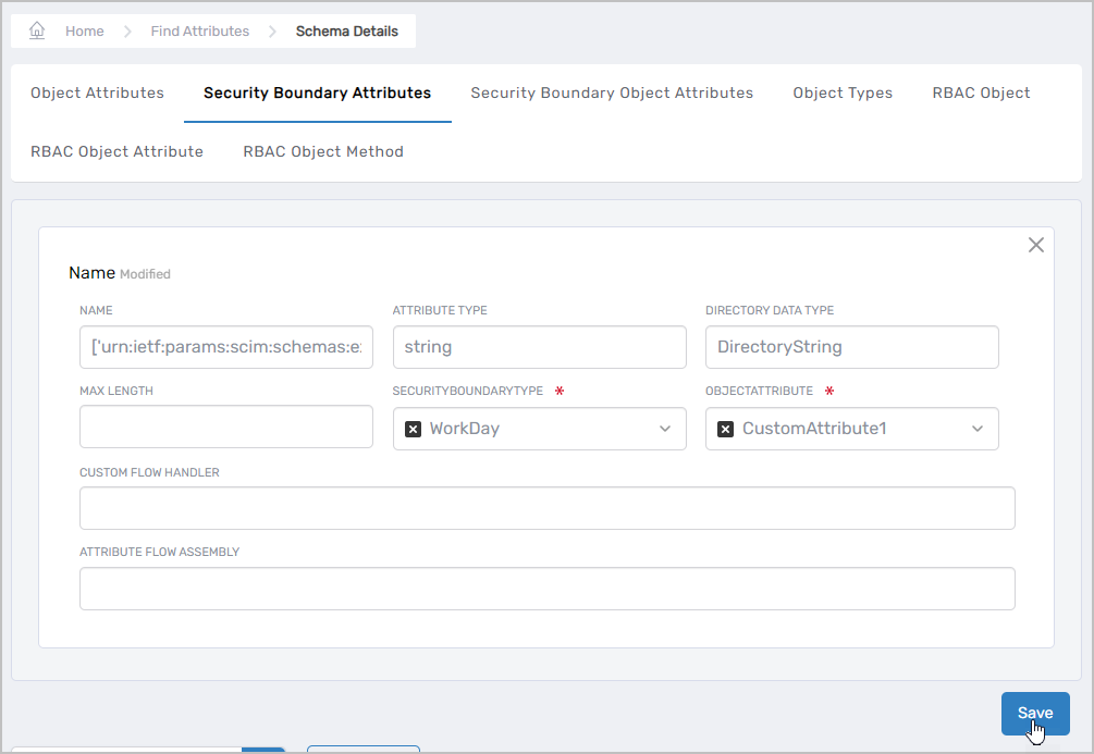 1. Select the Security Boundary Object Attributes tab on the Schema page and then click the Add + button on the grid header.