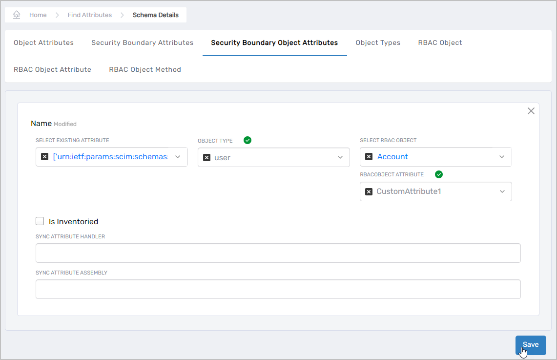 • Create a Security Boundary Object Attribute of Object Type User and map it to the corresponding RBAC Object Attribute in the Account table.
