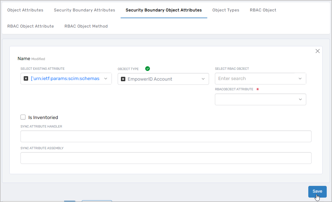 • Create a Security Boundary Object Attribute for EmpowerID Person of Object Type EmpowerID Account. This maps custom attributes to EmpowerID Accounts.