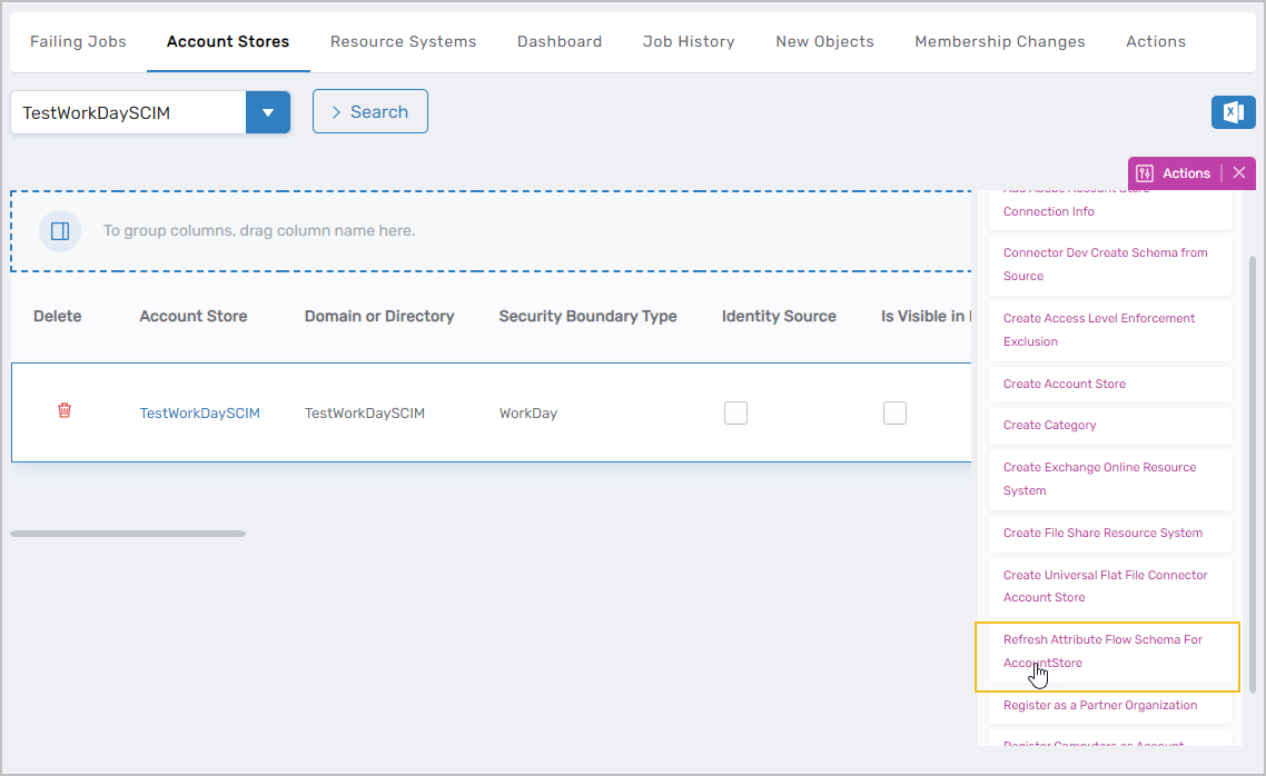 2. Select the Account Stores tab and click the Refresh Attribute Flow Schema for AccountStore action.