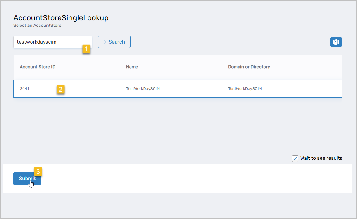 3. In the Account Store Lookup that appears, search for the Workday account store, click the record for the account store to select it, and then click Submit.