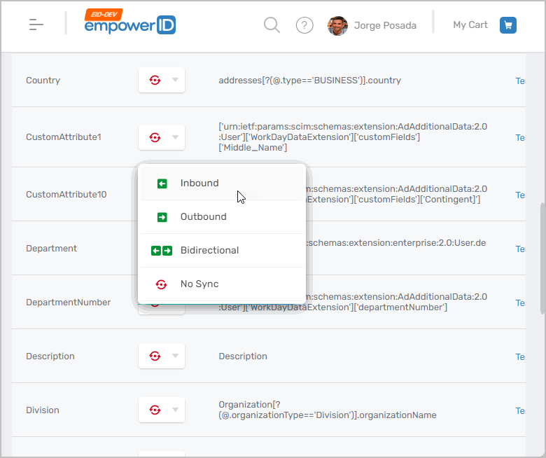 5. Review the attribute flow and revise as needed. EmpowerID translates the attributes in Workday to SCIM for use with the connector and represents those attributes in EmpowerID as External Directory Attributes. You map these attributes to EmpowerID Person attributes to ensure that any changes occurring to user attributes in Workday flow to the EmpowerID Person and any other user accounts owned by the Person.