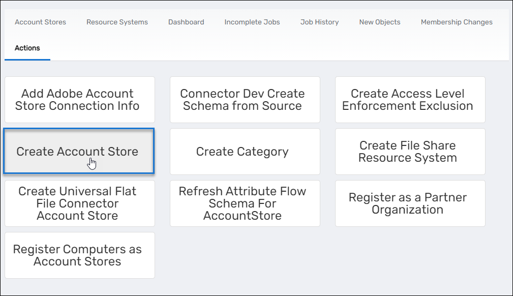 - On the Account Stores page, select the Actions tab and then click Create Account Store.
