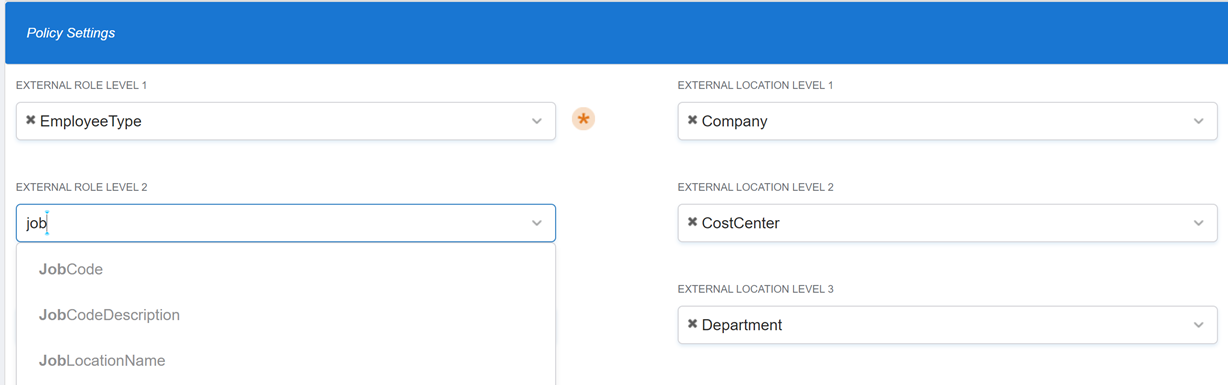 You can use Dynamic Hierarchy policies to automatically generate external Business Roles and Locations based on the value of a specified person attribute, such as the name of their department. After the policy is created, the Dynamic Hierarchy engine will add any account with the matching attribute values to the AccountExternalOrgRoleOrgZone table for use by the role and location compiler job. As seen below in the policy settings section of a dynamic hierarchy policy, you can select up to 3 attributes to build your external role tree and your external location tree. Each level represents a Parent/Child level in the tree as described below: