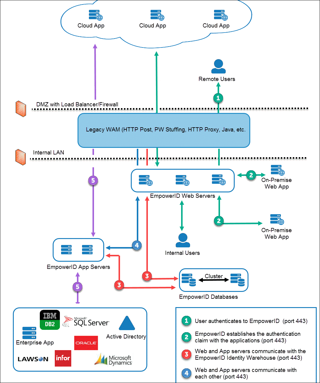 The below two images depict the EmpowerID Communications and Connectivity architecture. The first shows the architecture without EmpowerID WAM/Reverse Proxy, while the second shows the architecture with EmpowerID WAM/Reverse Proxy.