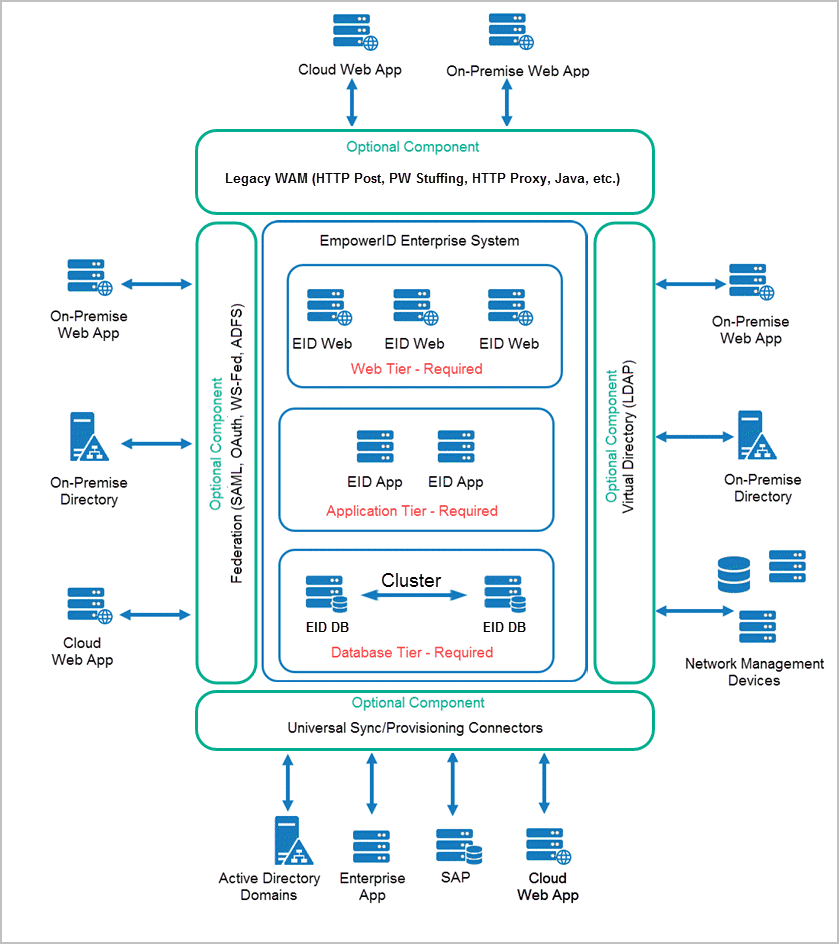 The below image depicts a typical representation of the EmpowerID on-premise Application and Process Architecture. All systems and components listed are internal components of the EmpowerID on-premise platform. The components listed as required are specific workflows and functions relevant to organizational requirements. The optional components includes functionality within provided module licensing.