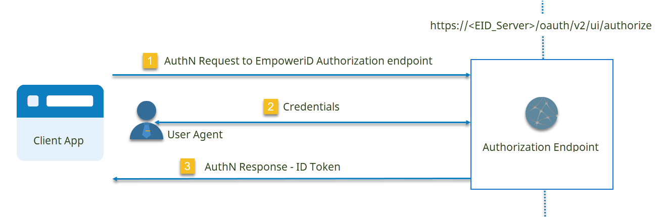 The sequence for authenticating using OIDC looks like that shown in the following image. As OIDC is used in OAuth 2.0 flows, the image is incomplete in that it only depicts the authentication stage of the flow. A more complete presentation of what occurs when using OpenID Connect in an OAuth 2.0 grant in EmpowerID is shown in the OAuth 2.0 Authorization Code Grant.